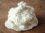 手紡ぎの毛糸を使用した白いニット帽は、ソフトクリームみたいでちょっとユーモラス。